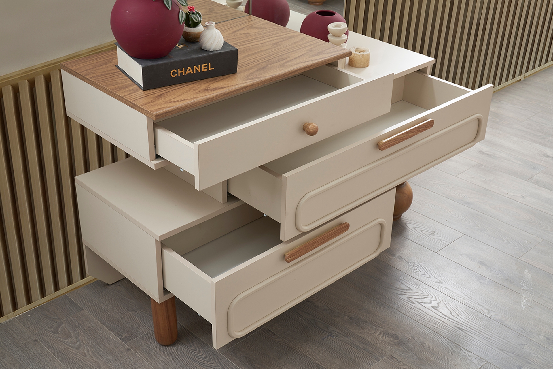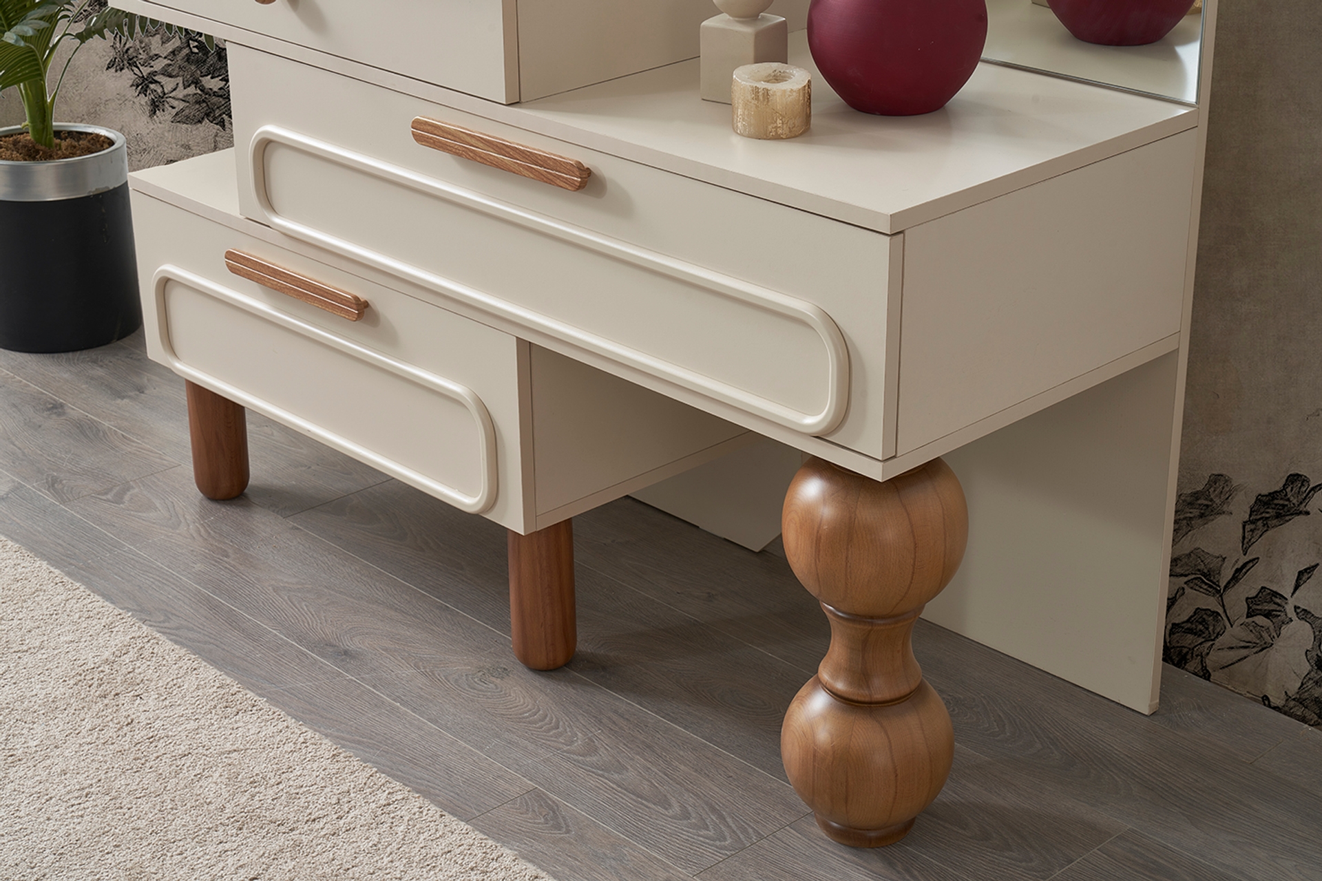 Mirror Detail: The chest of drawers includes both a full-length mirror and a small makeup mirror set.