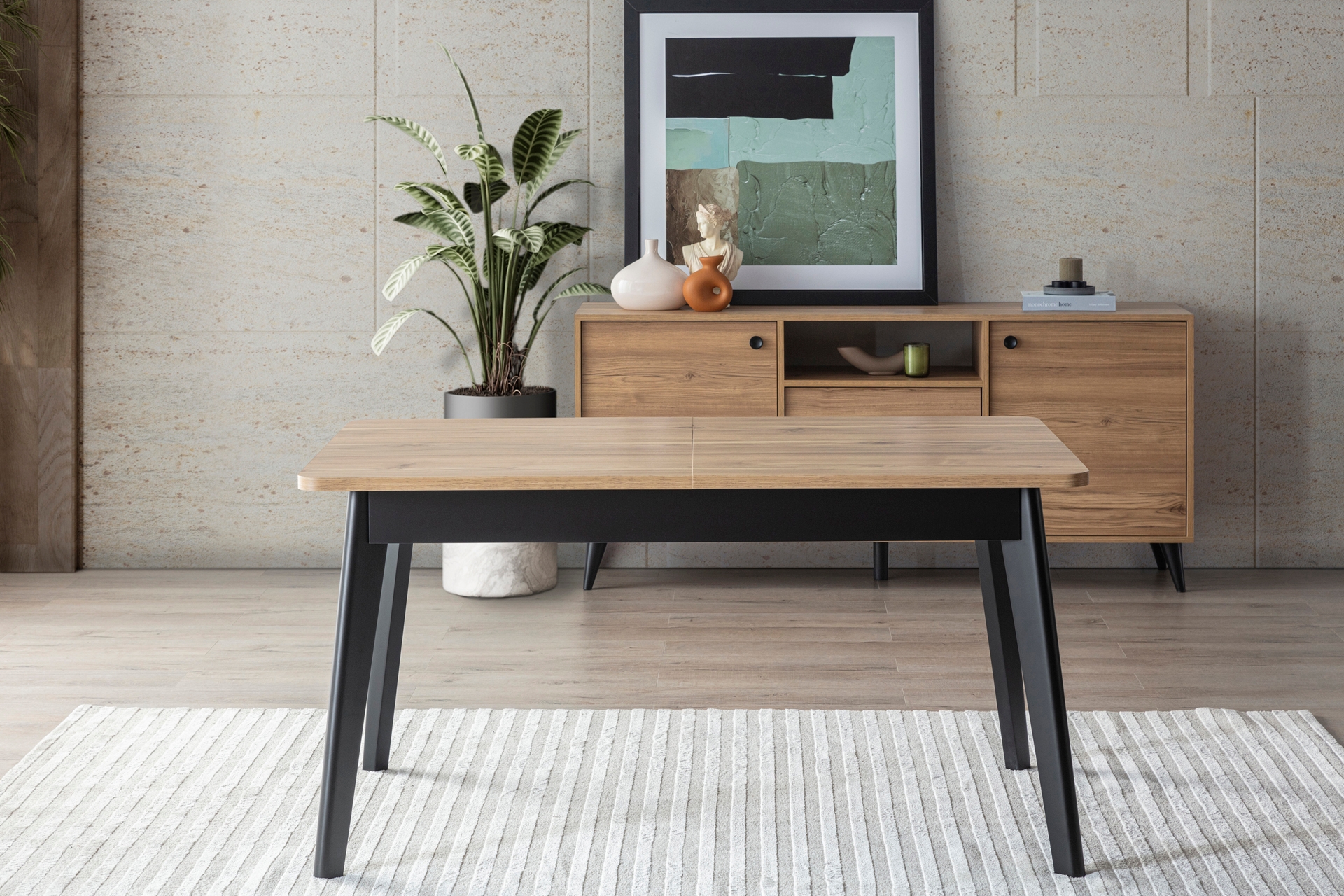 Ayak Malzemesi: Masada ahşap ayaklar kullanılırken; konsol, TV sehpası ve orta sehpa ayakları sert plastik malzemedir.